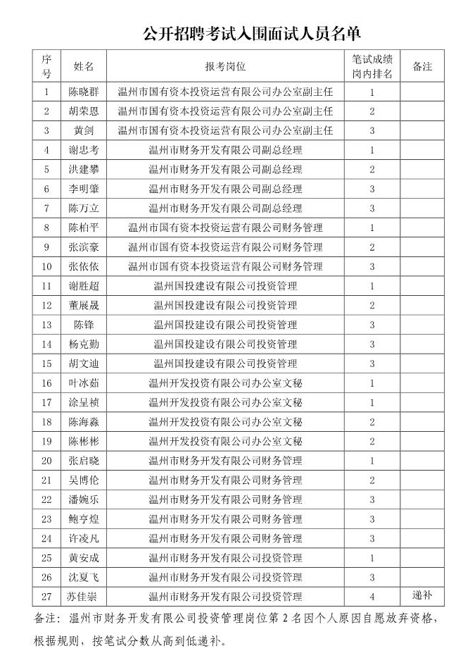根據(jù)《溫州市國有資本投資運營有限公司公開招聘工作人員公告》(以下簡稱《公告》)等有關(guān)要求,現(xiàn)將公開招聘筆試成績查詢及資格復(fù)審有關(guān)事項公告如下: