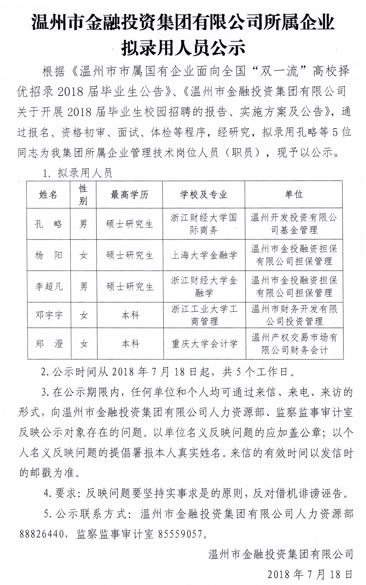 溫州市金融投資集團有限公司所屬企業(yè)擬錄用人員公示