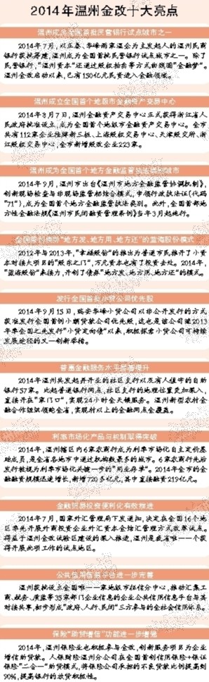 ??? 2014年是溫州金改的深化之年,創(chuàng)新突破不斷,在全國范圍內(nèi)率先探索和建立地方金融監(jiān)管體制,持續(xù)推進(jìn)民間融資走陽光化、規(guī)范化之路。2014年7月,以正泰、華峰兩家溫企為主發(fā)起人的溫州民商銀行獲批籌建,溫州成為全國首批民營銀行試點(diǎn)城市之一。